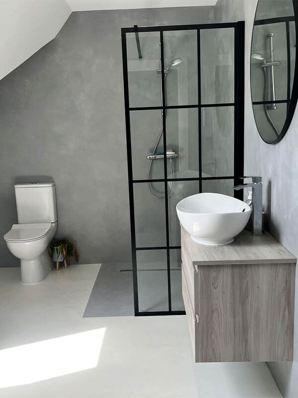 Покрытие идеально подходит для создания монохромных или контрастных интерьеров — оно гармонично сочетается с керамикой, стеклом, металлом и деревом. Благодаря отсутствию швов и возможности нанесения на стены и потолок, Muratore обеспечивает целостность пространства и упрощает уход за поверхностями.