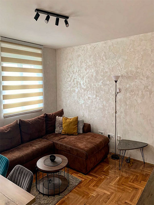 Поверхность не отражает свет, а мягко рассеивает его, подчеркивая объем и фактуру стены. Это делает интерьер визуально спокойным, уютным и благородным. Покрытие легко очищается, не требует дополнительной покраски и сохраняет свой внешний вид на протяжении многих лет даже в помещениях с интенсивной эксплуатацией — таких как холлы, гостиные или офисы.