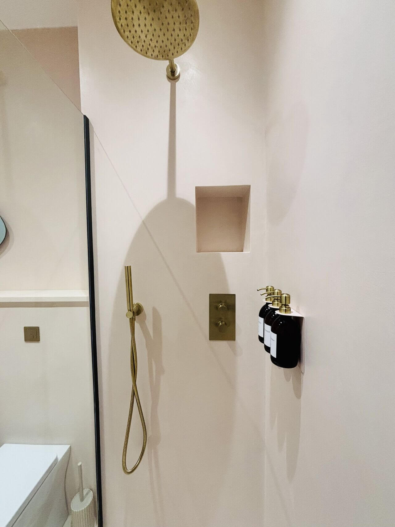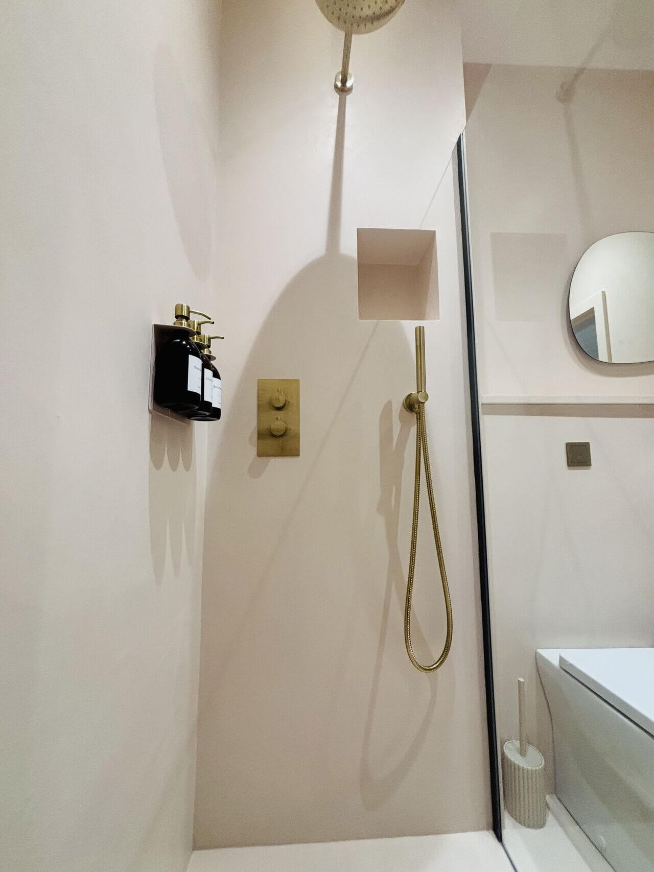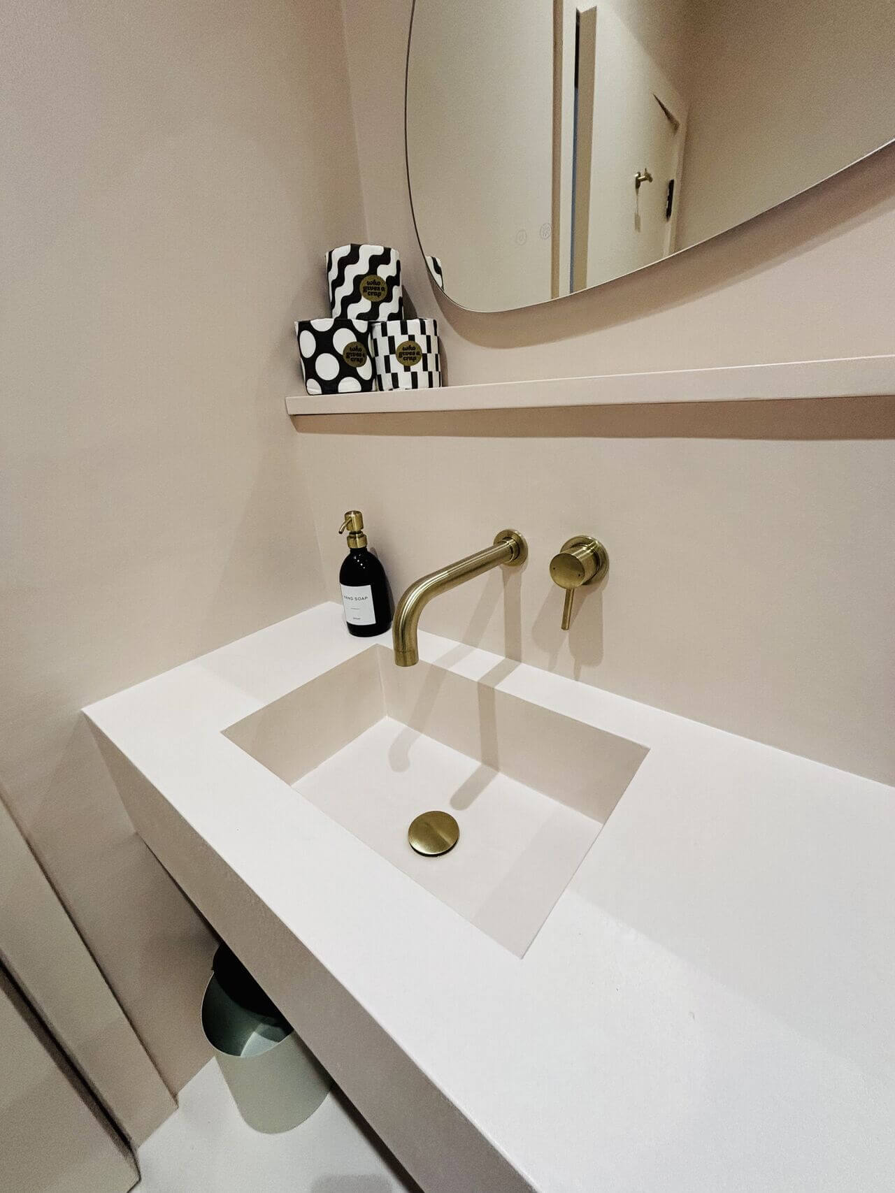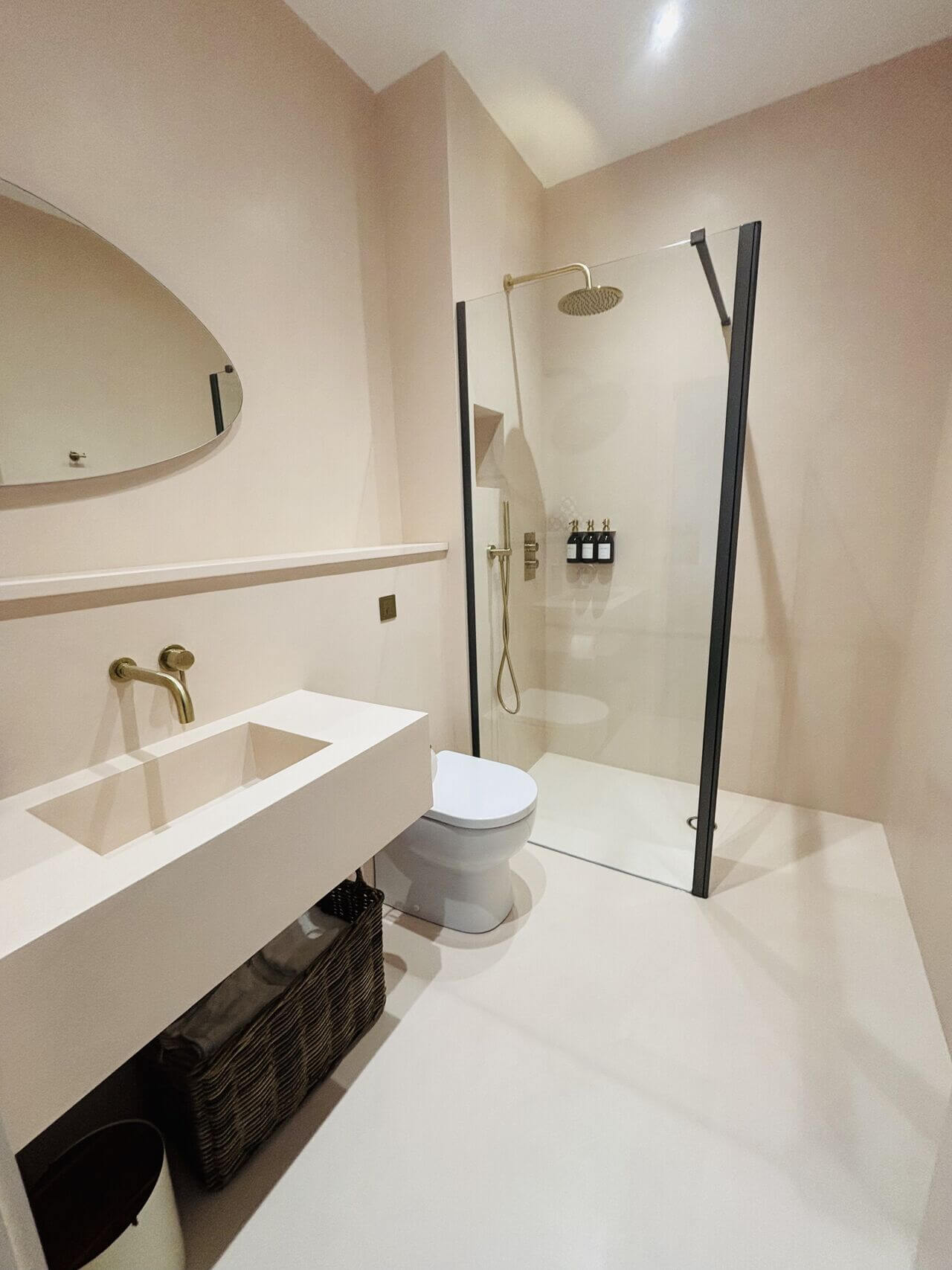отделки ванных комнат. Покрытие создает монолитную поверхность без швов, устойчивую к постоянному контакту с водой, перепадам температур и образованию плесени. При этом оно обладает мягкой бархатистой текстурой и глубоким цветом, придавая интерьеру ощущение уюта и роскоши.