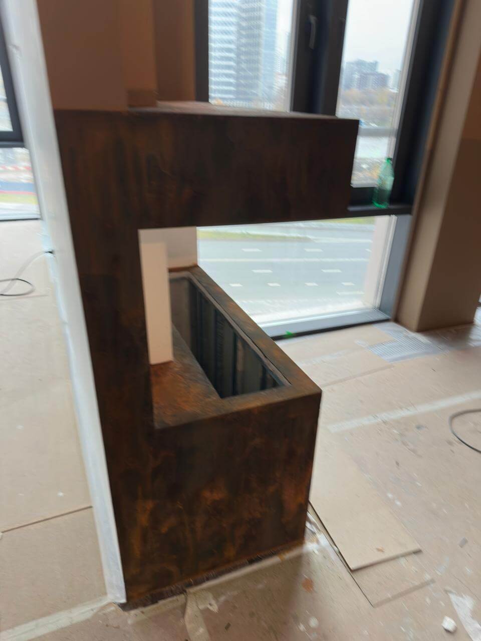 Фальшкамин из декоративной штукатурки под эффект металла — уникальное сочетание благородной текстуры травертина и состаренного металла. Основа выполнена из Marmo Travertino 500, а металлический эффект достигнут с помощью декоративной краски Ferro и активатора коррозии Ironic, создающего эффект натуральной патины. Результат — элегантный, долговечный и визуально выразительный элемент интерьера, который станет центром любой гостиной.
